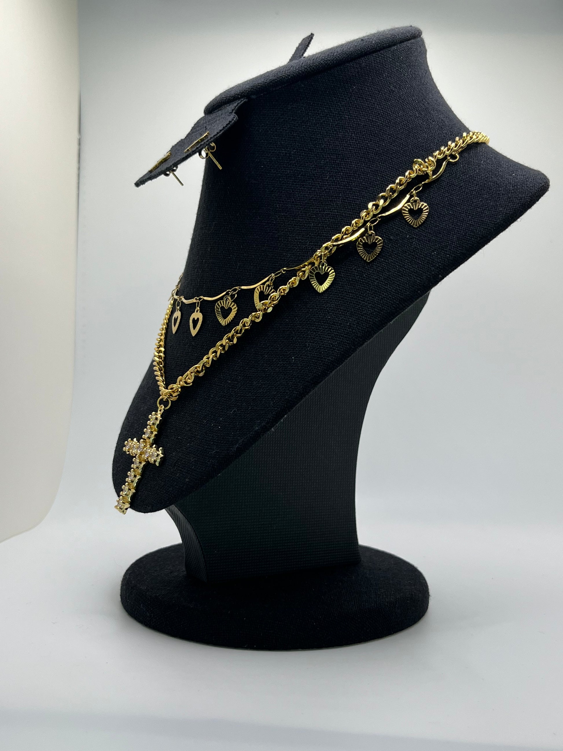 Stainless Steel Gold Tone Layered Heart and Cross Necklace Set