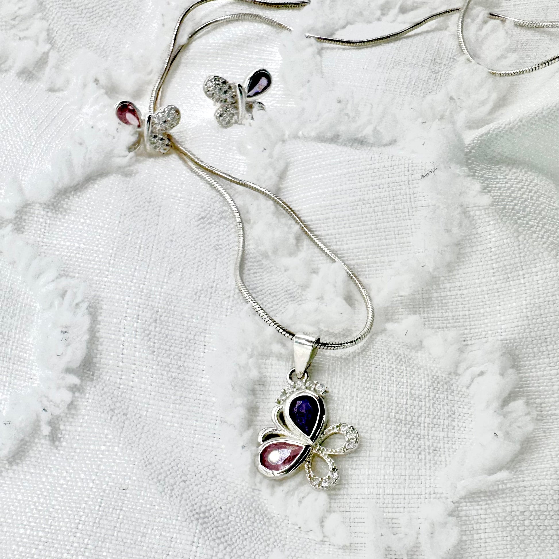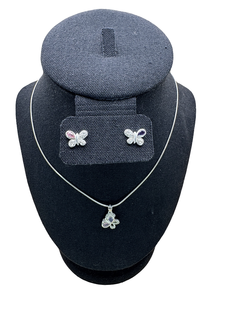 Silver Butterfly Pendant Necklace with Crystal Accents and Earrings set